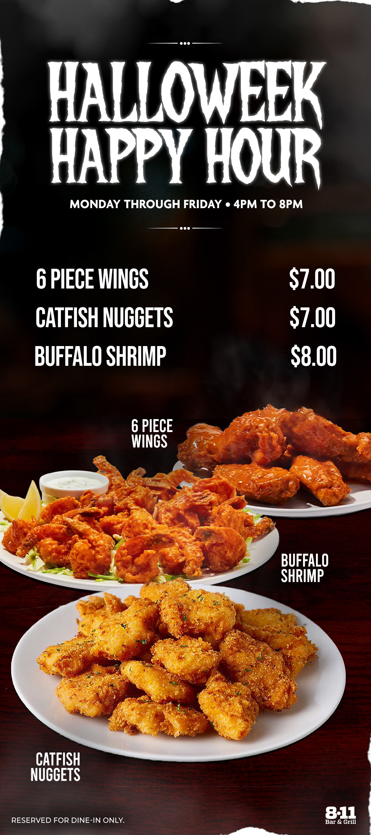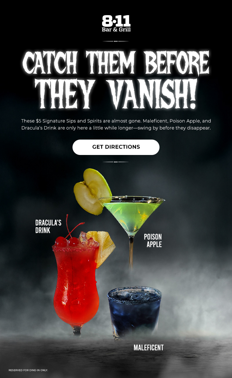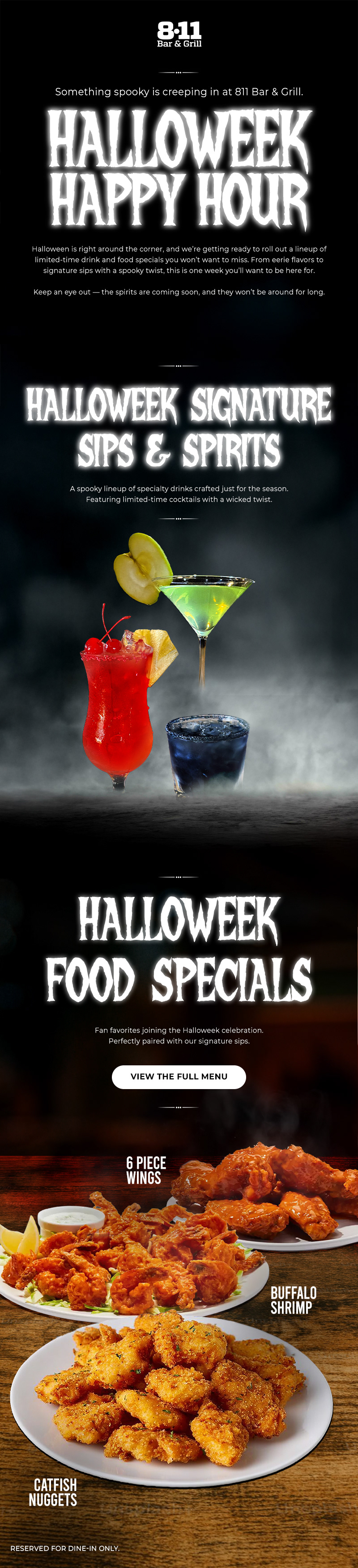 Halloweek was a week-long seasonal campaign for 811 Bar & Grill promoting limited-time drink specials through a coordinated mix of email marketing, social media graphics, and in-venue print materials. The campaign focused on building anticipation and urgency while maintaining a cohesive visual tone across digital and physical touchpoints to drive in-person traffic.