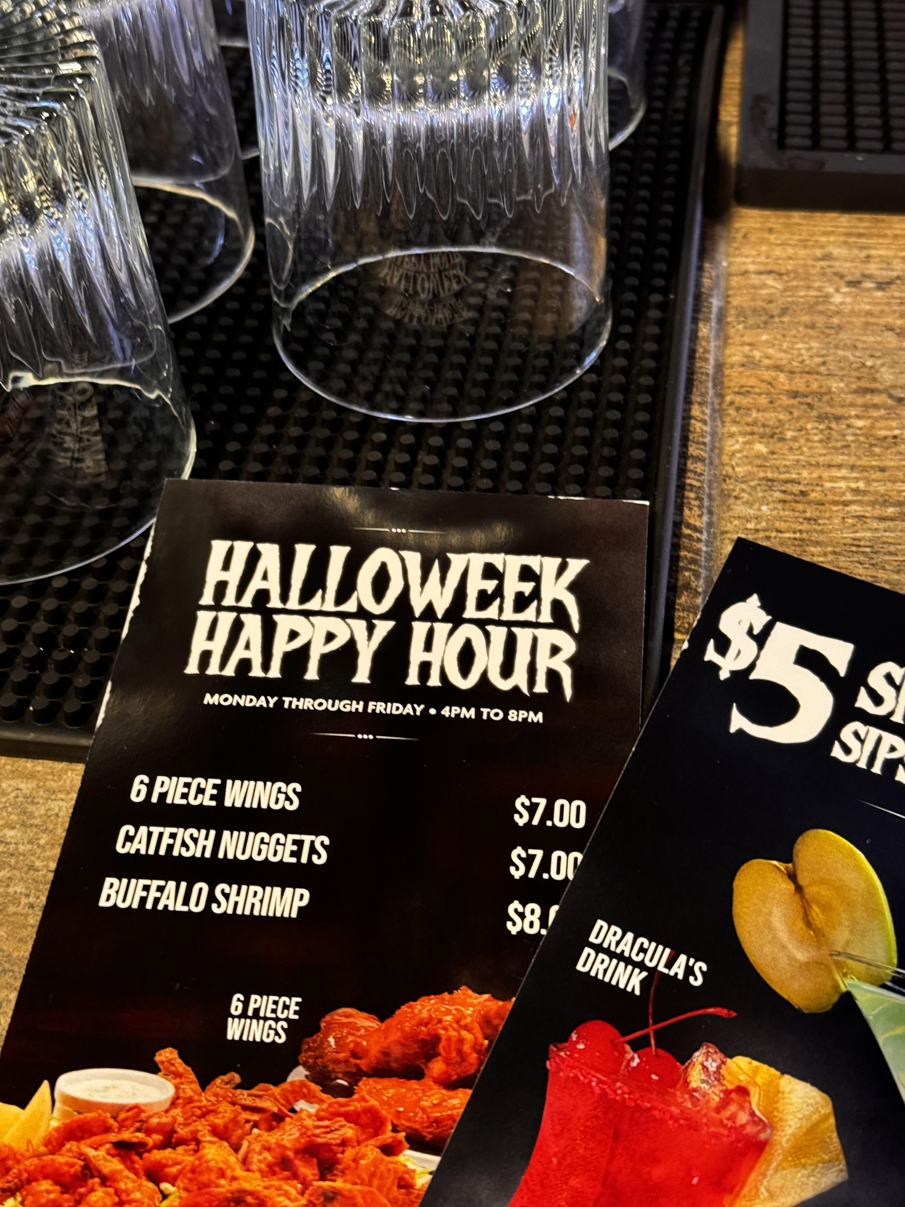 Photograph documenting the Halloweek menu inserts displayed in-venue, demonstrating real-world application of the campaign materials.