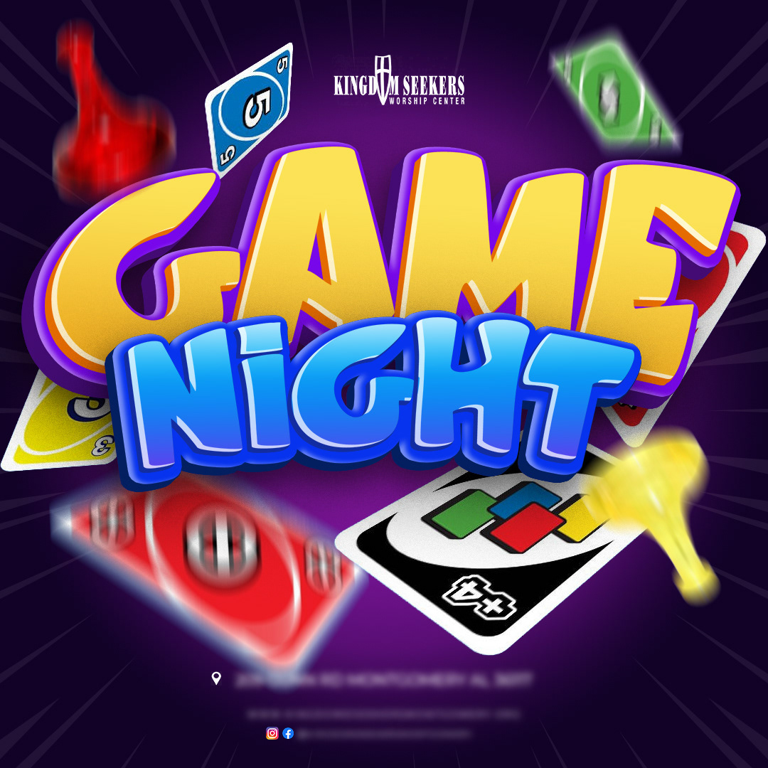 A promotional social post designed to build excitement and drive attendance for a community game night event.